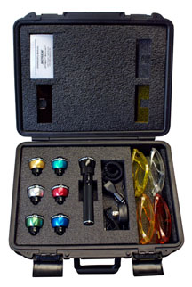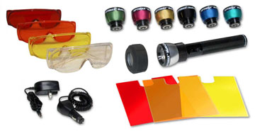 多波段警用檢查光源配有結(jié)實的黑色陽化鋁手電殼體、七個可快速更換的LED燈頭(UV-A(長波紫外)、藍光、藍綠光、綠光、琥珀光及白光)、三個插入式濾色板(黃色、橙色及紅色)、交流及直流充電器、四個眼鏡(紫外防護、橙色、黃色及紅色眼鏡)及一個手提箱。