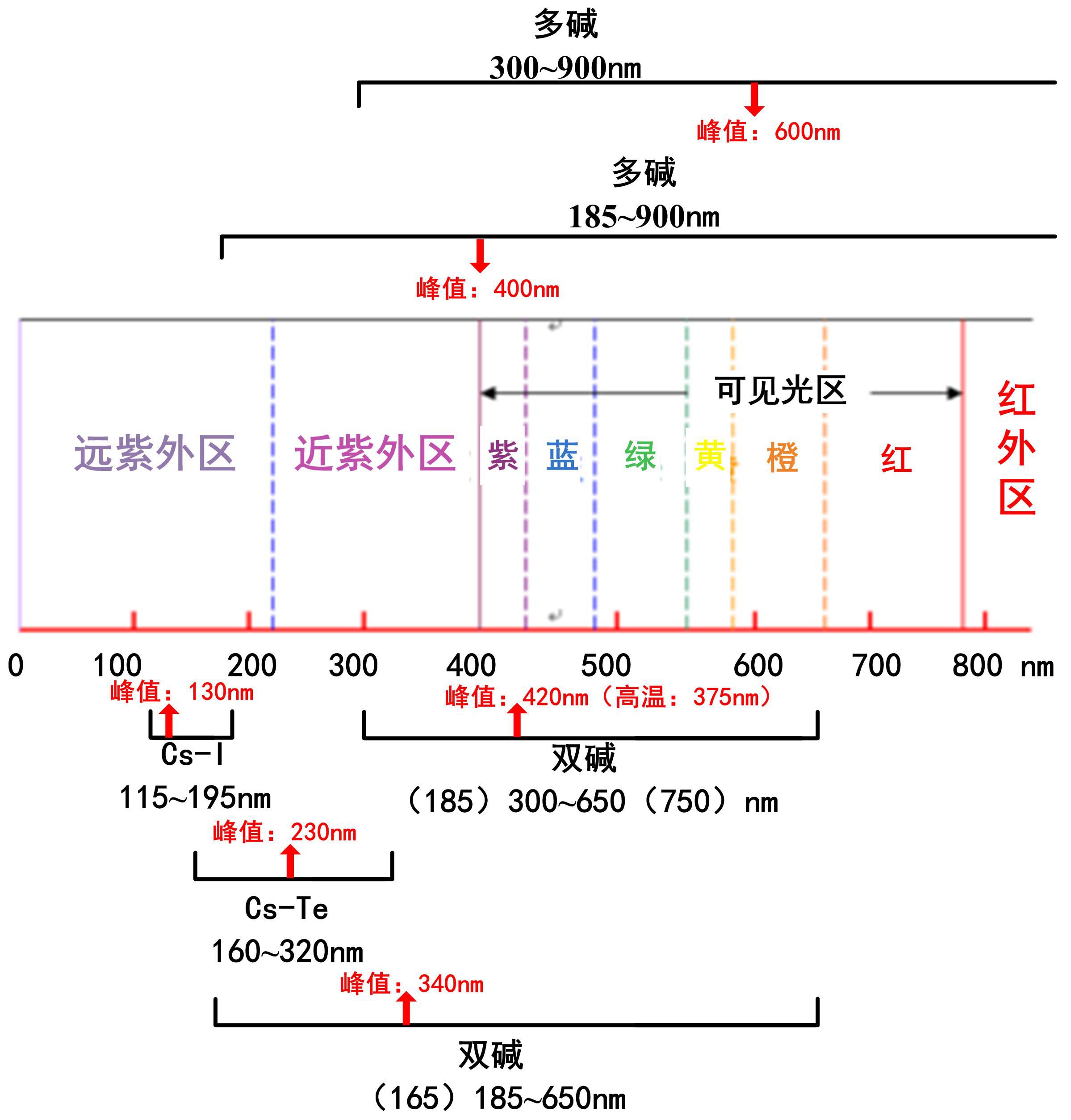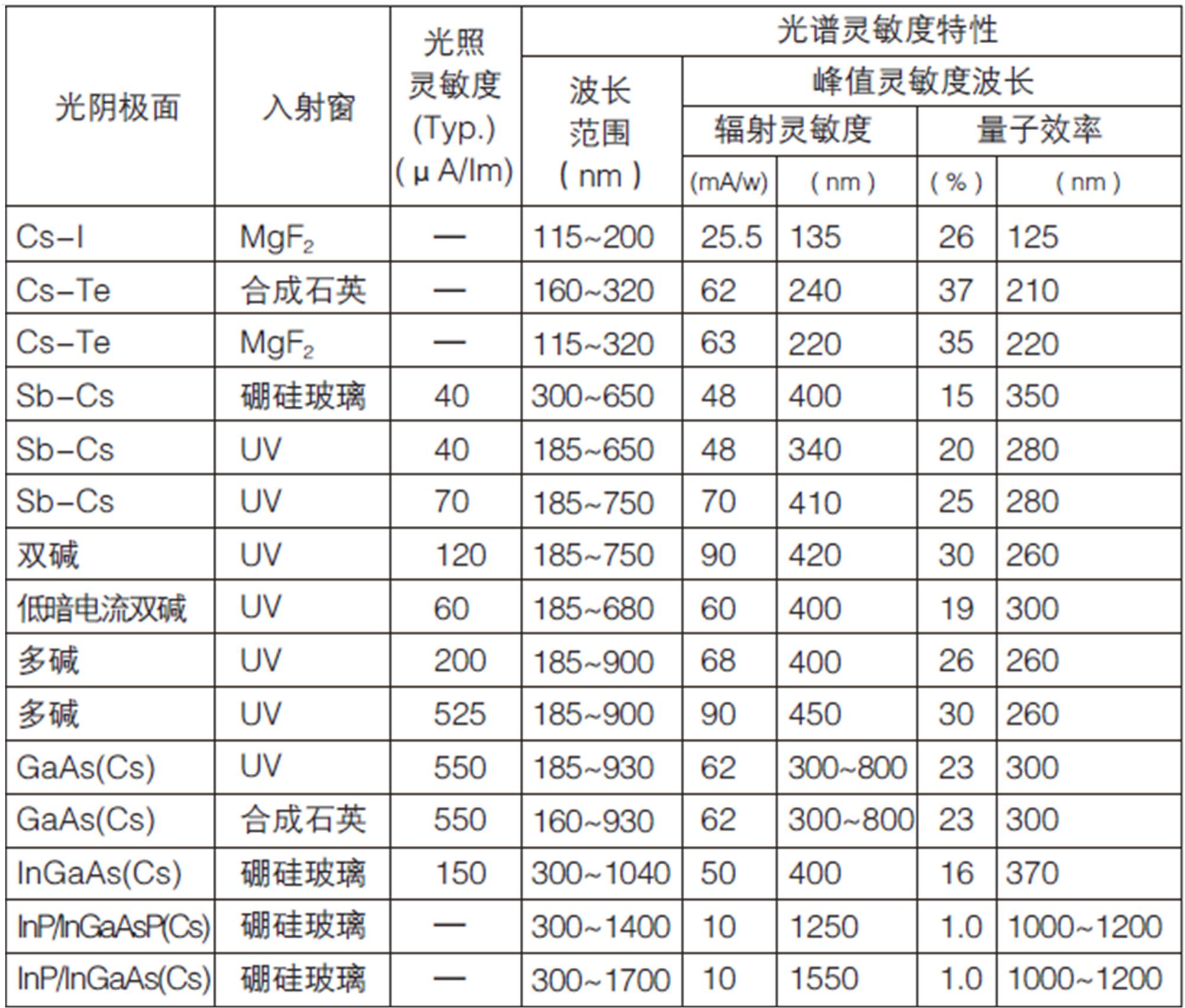 雖然PMT可探測光譜范圍很寬,但每一種管型可直接響應(yīng)的波段范圍是有限的,為使其探測效率得到充分利用,同時又不造成性能及成本的浪費,需要根據(jù)入射光的波長選擇合適波段的PMT,如圖1所示。