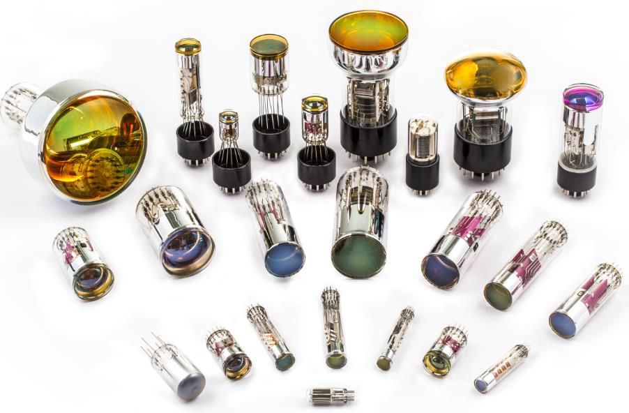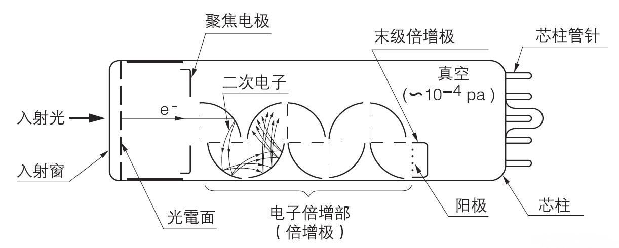 光電倍增管(Photomultiplier Tube,簡稱PMT)是一種真空玻璃器件,可將光信號轉(zhuǎn)化為電信號,因超高靈敏度和快速響應(yīng)等特點備受關(guān)注。在檢測光譜方面,其可探測約100nm~1μm范圍內(nèi)的光信號。此外,在更短波方向,如γ射線、X射線探測使用的輻射探測器,以通過各種閃爍體轉(zhuǎn)化成可見光,然后再通過PMT進行檢測,其關(guān)鍵器件也是PMT。