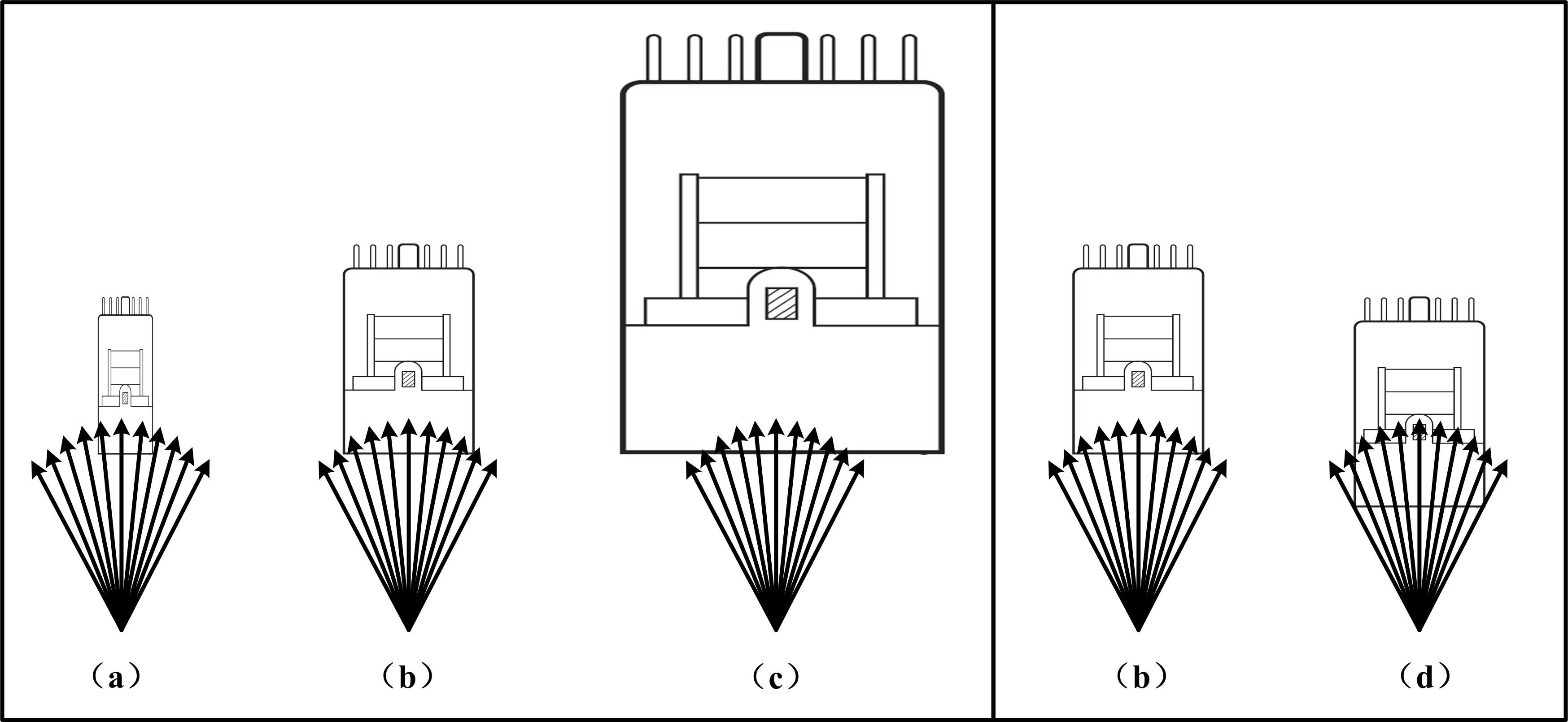 根據(jù)入射光的光斑形狀、大小、與PMT的距離關(guān)系等選擇合適的PMT。如狹縫形的光斑更適合用側(cè)窗型PMT。陰面大小選擇以盡量多的收集光束為原則,如圖2所示,在光源特性完全一致的情況下,(a)PMT陰面尺寸略小,不能有效收集光信號;(c)光信號雖可全部入射到PMT上,但光斑相對陰面尺寸過小,陰面邊緣部分沒有有效信號,卻會產(chǎn)生噪聲,使信噪比下降;(b)尺寸的選擇明顯優(yōu)于(a)和(c);(d)相比(b)而言,減小光源與PMT之間的距離,可提高光信號的收集效率、增大PMT的探測效率,是PMT的方案。
