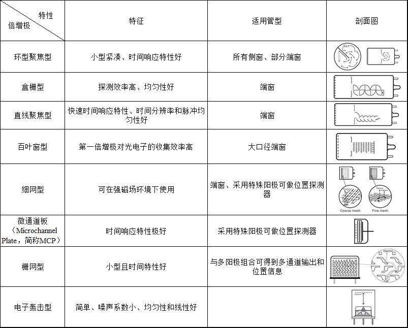 倍增有許多種類,由于其結(jié)構(gòu)、倍增的級數(shù)的不同而使得電流增益、時間響應(yīng)特性、均勻性、二次電子收集效率特性等不同,要根據(jù)使用目的做相應(yīng)的選擇。各倍增種類如表3所示。