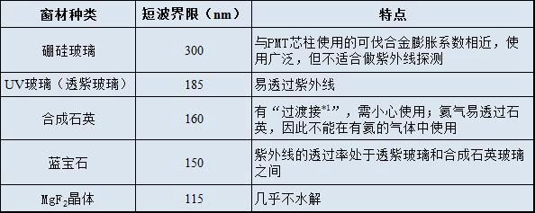 不同入射窗材料對紫外線的吸收特性有很大區(qū)別,這也決定了PMT光譜范圍的短波區(qū)界限,常用窗材如表1所示。