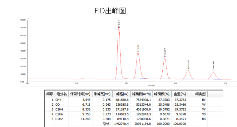 以氬氣為載氣前裝置六通閥進樣經(jīng)色譜儀六通閥相連的預處理柱進行分離,在氫氣,氧氣,氮氣,甲烷,一氧化碳進入5A分子篩柱而CO2未出預處理柱前六通閥反吹出的二氧化碳及碳、乙烯、丙烷等進入FID2充檢測柱,由FID2測器檢出碳二碳三烴烷類,而經(jīng)5A柱分離的氫氣,氧氣,氮氣,甲烷,一氧化碳進入TCD檢測器,檢出氫氣,氧氣,氮氣;樣品氣再經(jīng)轉化爐進FID檢出甲烷,一氧化碳。另一路經(jīng)RB-WAX毛細FID1檢出醇、醛、酸等液態(tài)產(chǎn)物。