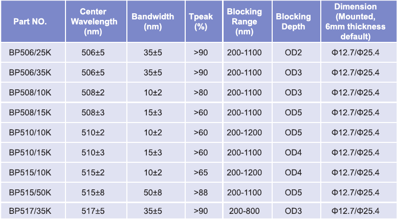 帶通濾光片波長范圍:506nm-517nm