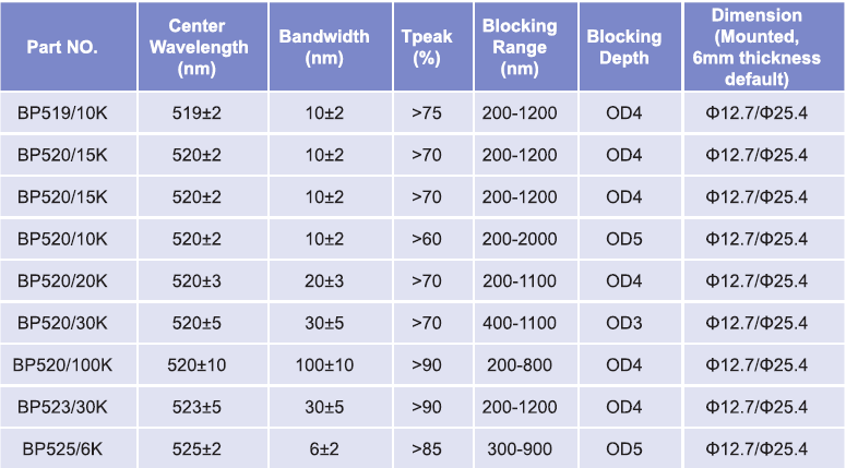 帶通濾光片波長范圍:519nm-525nm