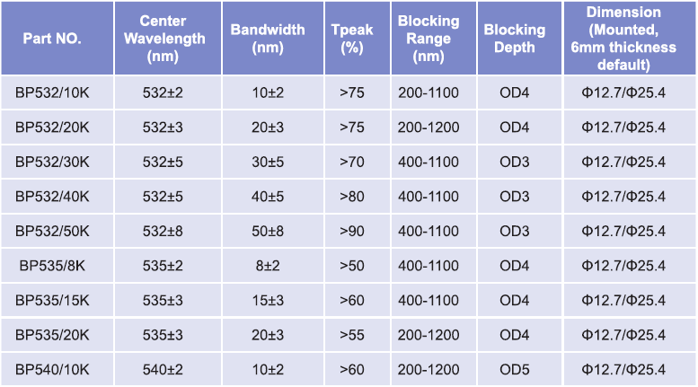帶通濾光片波長范圍:532nm-540nm