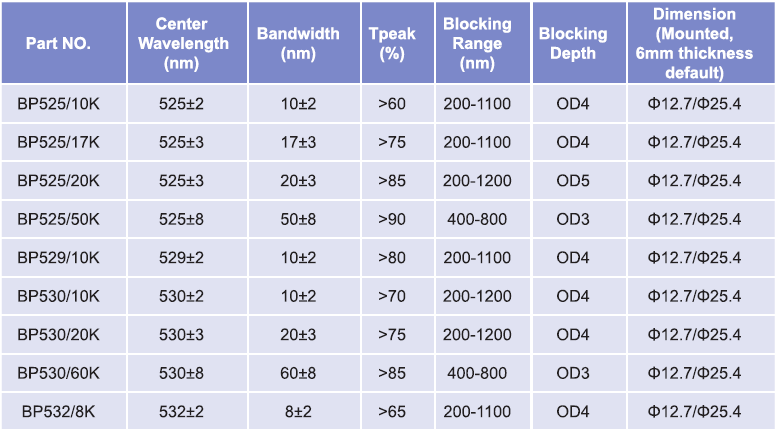 帶通濾光片波長范圍:525nm-532nm