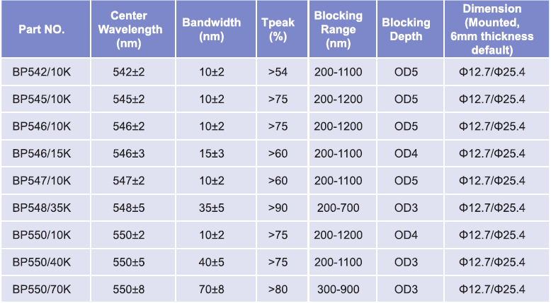 帶通濾光片波長范圍:542nm-550nm