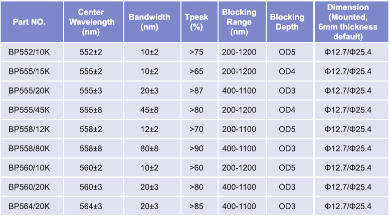 帶通濾光片波長范圍:552nm-564nm