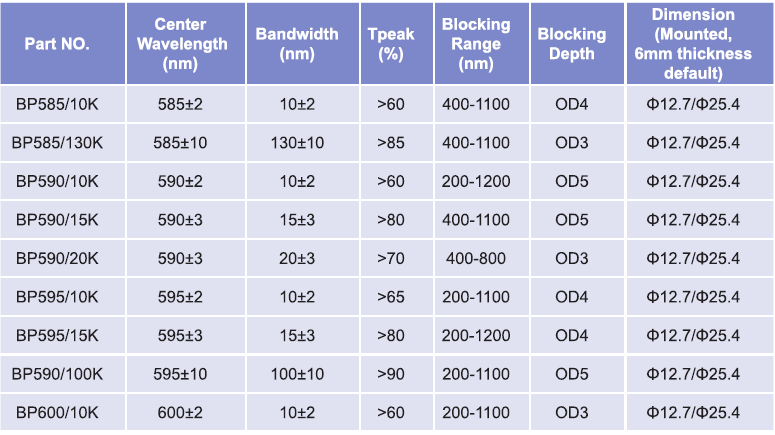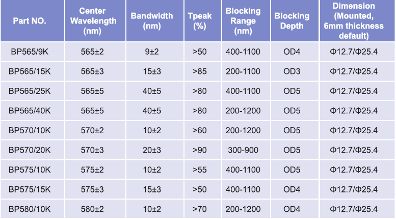 帶通濾光片波長范圍:565nm-580nm