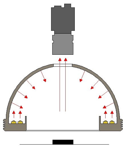 光源從底部發(fā)光,經(jīng)過(guò)多次漫反射形成無(wú)影光源,DOME光源是一種高均勻性的光源,適用于表面凹凸不平、反光物體檢測(cè)。