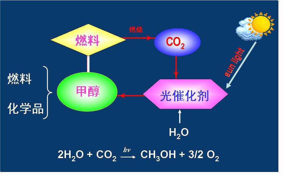其一是經(jīng)太陽能化學(xué)和生物轉(zhuǎn)化分解水制氫,然后將氫與CO2經(jīng)傳統(tǒng)的光催化轉(zhuǎn)化為甲醇,和其他的化學(xué)品,即:H2O H2 + 1/2O2H2 + CO2 CH3OH,凈反應(yīng):H2O + CO2 CH3OH + O2↑。此過程的關(guān)鍵科學(xué)問題是:(1)開發(fā)高效光催化劑;(2)將光催化制取的氫從反應(yīng)體系中有效分離,并與CO2催化轉(zhuǎn)化耦合。