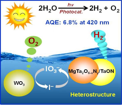 近日,中國科學(xué)院大連化學(xué)物理研究所催化基礎(chǔ)國家重點實驗室及潔凈能源國家實驗室太陽能研究部研究員、中科院院士李燦和研究員章福祥、陳閃山等與日本東京大學(xué)教授Kazunari Domen課題組合作,在可見光驅(qū)動光催化Z機制完全分解水制氫研究中取得進展。研究結(jié)果發(fā)現(xiàn),經(jīng)一步氮化合成的MgTa2O6xNy/TaON異質(zhì)結(jié)材料(長可吸收波長達570 nm)可有效促進光生電荷分離,基于此異質(zhì)結(jié)材料構(gòu)筑的寬光譜響應(yīng)Z機制完全分解水制氫體系,其表觀量子效率達到目前文獻報道高值(AQE: 6.8%@420 nm)。相關(guān)結(jié)果在線發(fā)表在《德國應(yīng)用化學(xué)》期刊上。