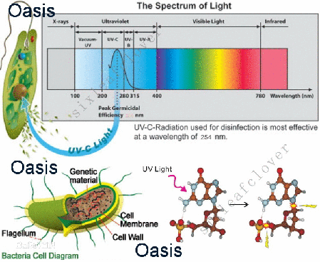 波長在240~280nm范圍內的紫外線可以破壞細菌病毒DNA(脫氧核糖核酸)或RNA(核糖核酸)的分子結構,造成生長性細胞死亡和(或)再生性細胞死亡,達到滅菌消毒的效果。尤其是波長為254nm的紫外線,滅菌消毒的效果強且不會產生臭氧造成二次污染。有待于進一步發(fā)展和研究。